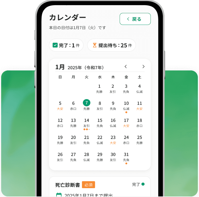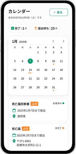 行った手続きの確認や今後の手続きをカレンダーで前もって確認できます。