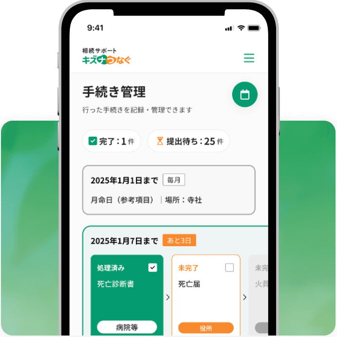 相続サポート「キズナつなぐ」とは、家族みんなが安心して相続手続きを進められるサービス。簡単操作で手続きや書類をガイドし、管理や共有もスムーズ。相続手続きの負担を減らし、家族のつながりをサポートします。