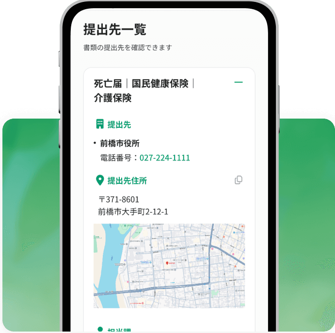 入力された故人の情報に基づき、手続きごとに書類の提出先住所、電話番号、地図が表示されます。
